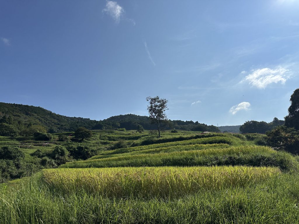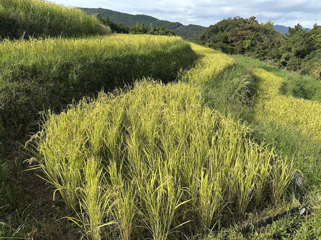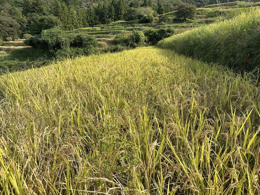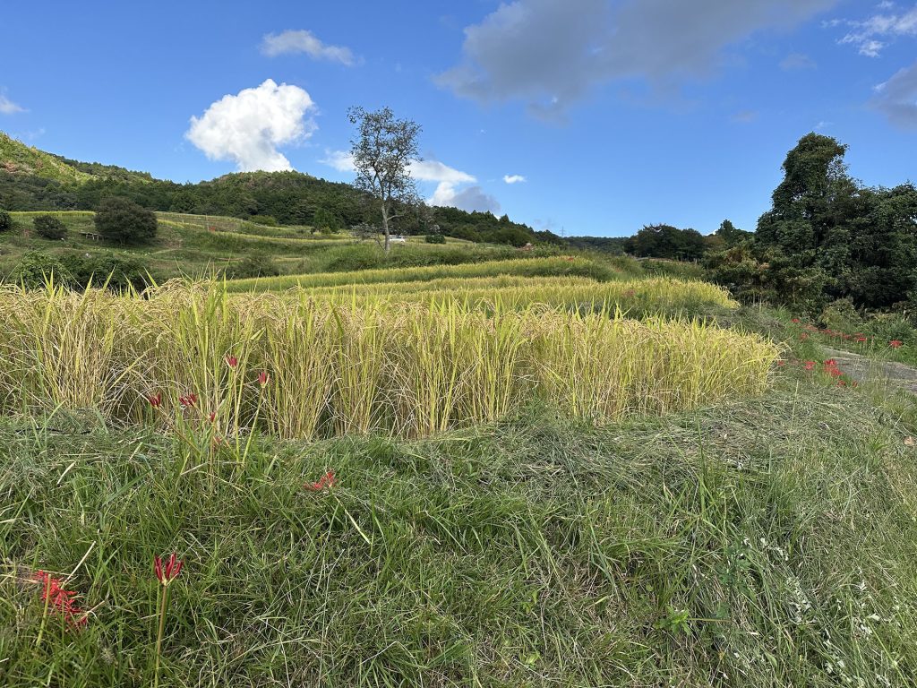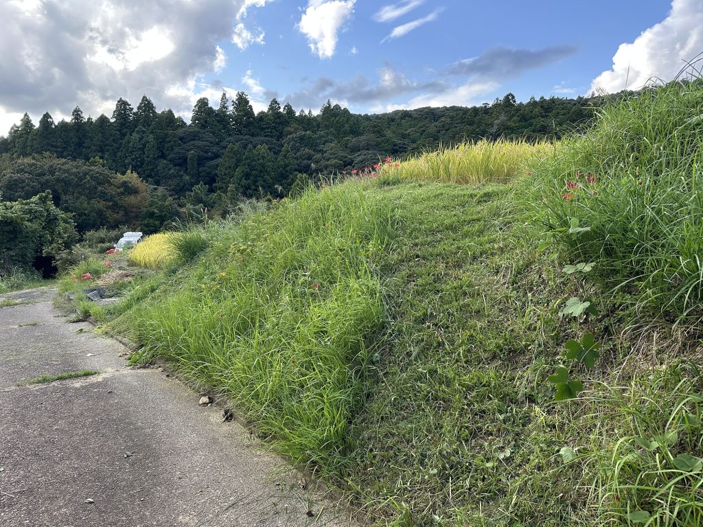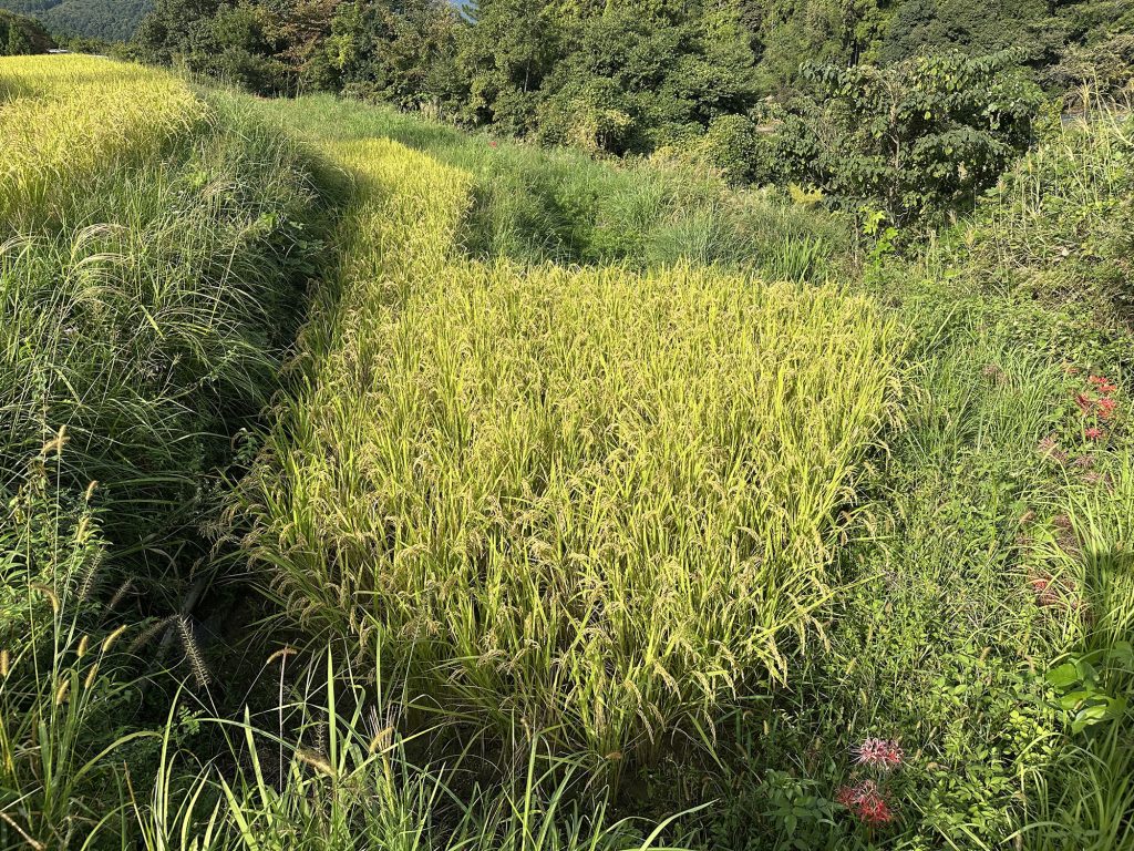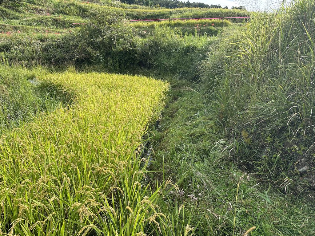 今日は稲刈りのために、畔周りとボタ面の草刈り。こうしておくと稲刈りでまず手刈りにする部分がやりやすいのである。