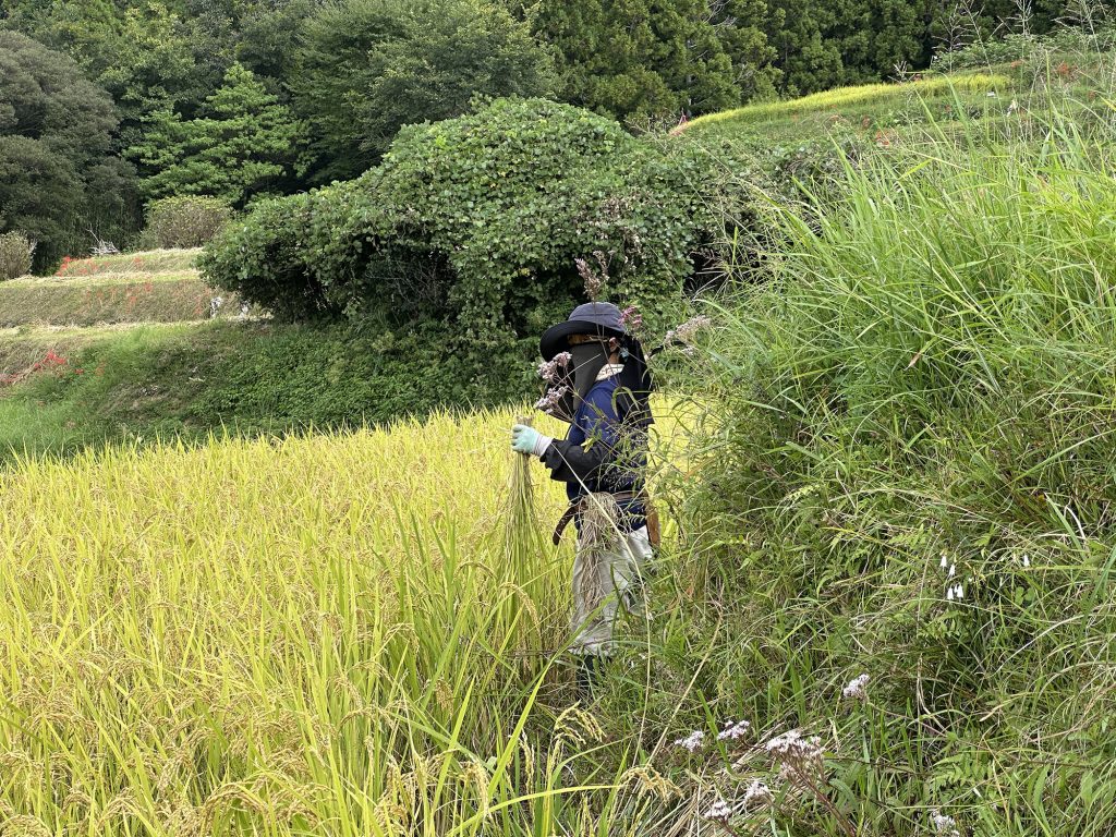 それから、落ちた畔付近の稲はこれ以上崩れてもいけないので、先に稲刈りをしておく。