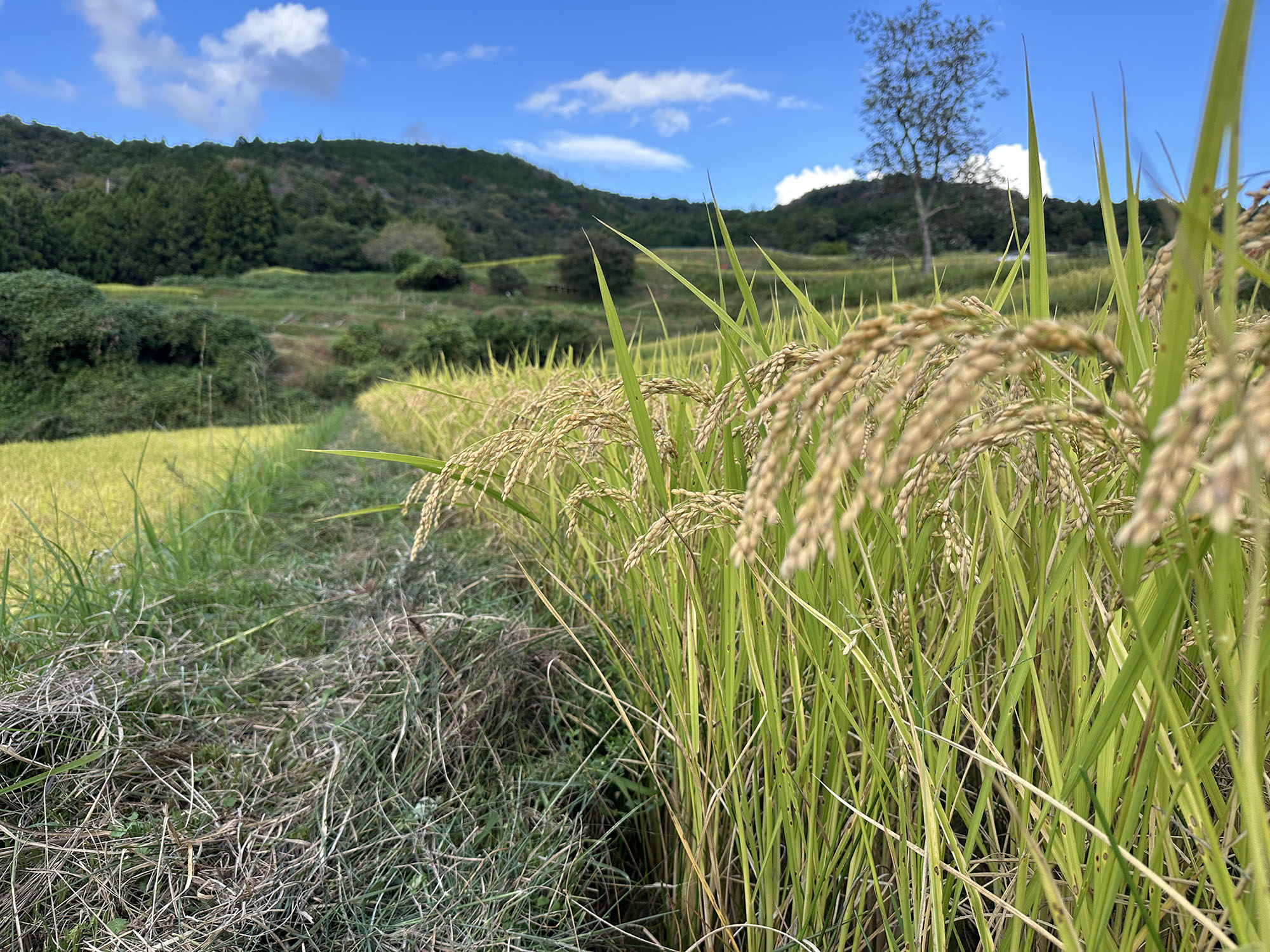 今日は稲刈りのために、畔周りとボタ面の草刈り。こうしておくと稲刈りでまず手刈りにする部分がやりやすいのである。
